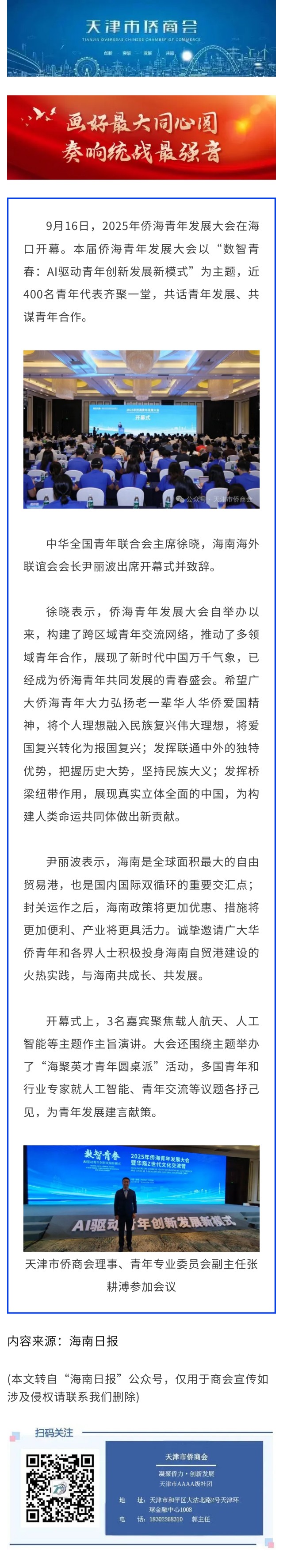 青业会动态|2025年侨海青年发展大会在海口开幕,天津市侨商会理事、青年专业委员会副主任张耕溥参加会议