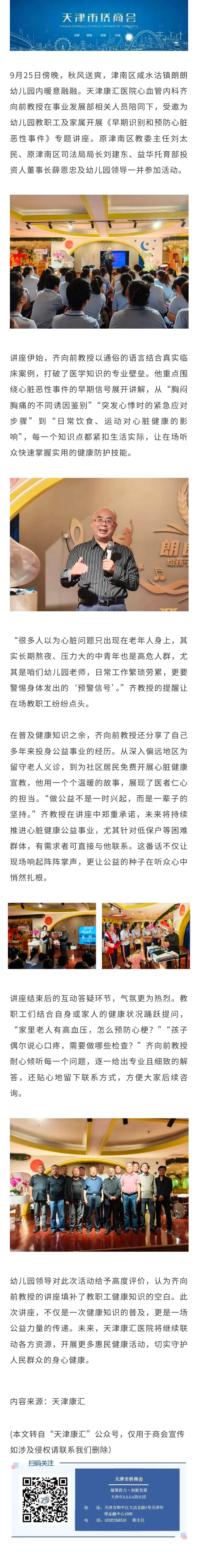 会企时讯 | 天津市侨商会会员、天津康汇医院齐向前教授走进津南区朗朗幼儿园科普心防知识