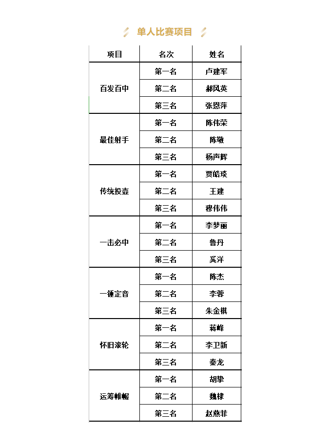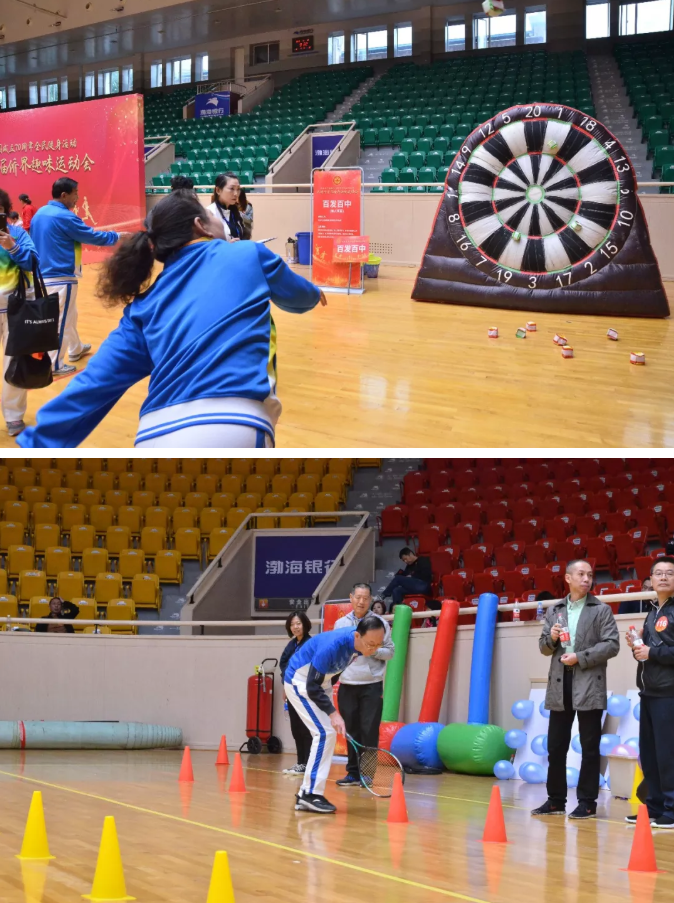 运动会比赛项目有百发百中、袋鼠运瓜、拔河、最佳射手、一击必中、怀旧滚轮、一锤定音、一马当先、运筹帷幄、传统投壶等十项,涵盖老中青三代的趣味体育运动。
