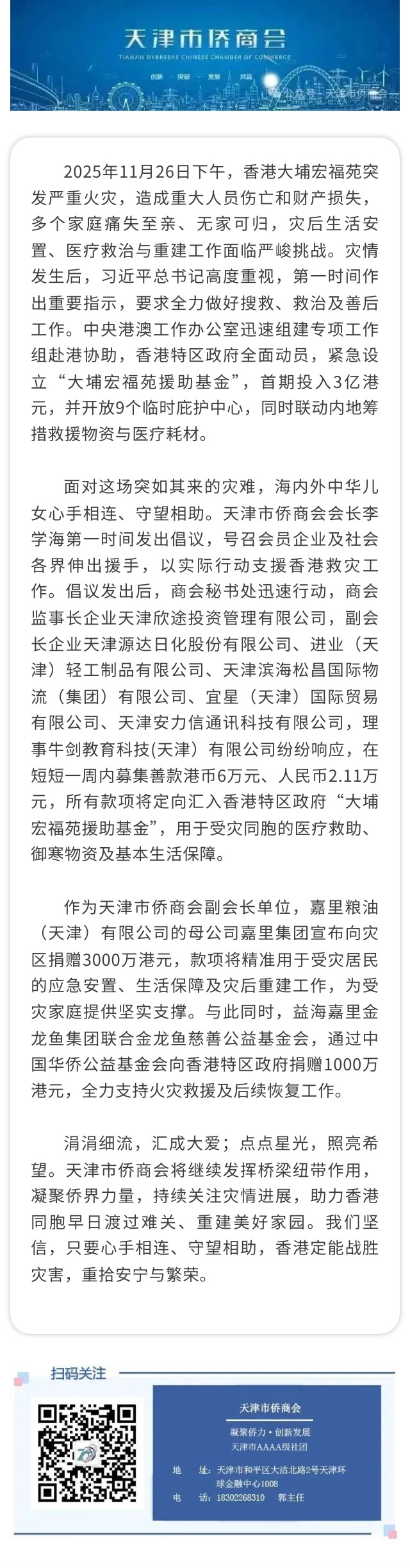 守望相助 情暖香江 —— 天津市侨商会迅速响应援助大埔宏福苑受灾同胞
