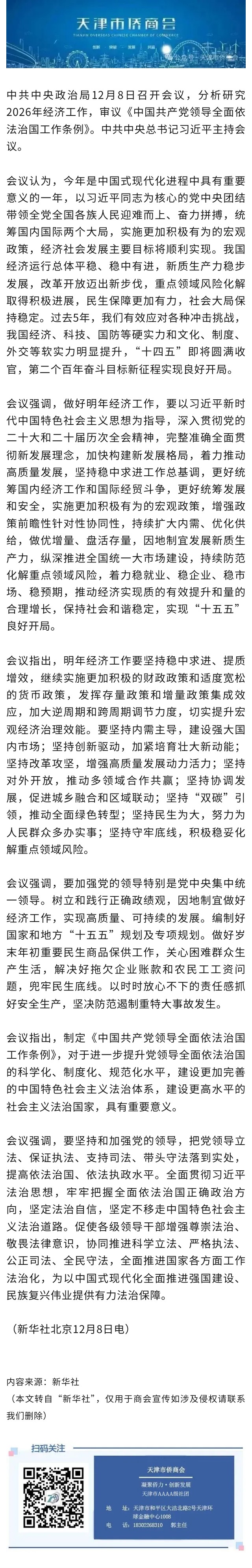中共中央政治局召开会议 分析研究2026年经济工作 审议《中国共产党领导全面依法治国工作条例》 习近平主持会议